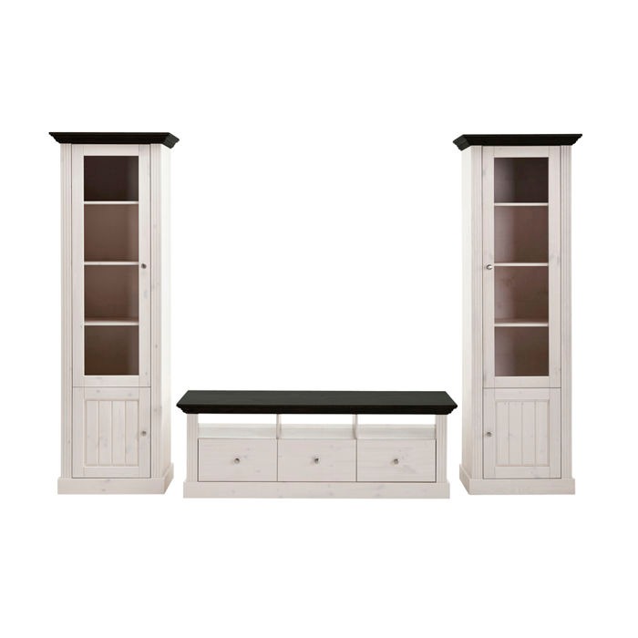 Biało – czarny romantyczny salon MONACO to wyjątkowy zestaw specjalnie dobranych, eleganckich mebli. Zaspokoi gust nawet najbardziej wybrednych i wymagających klientów. Utrzymany w romantycznym stylu łączy w sobie elementy klasyki i nowoczesności. Dwie przeszklone witryny oraz szafka TV wykonane są z przepięknej sosny bielonej, która wypełni blaskiem ciemne pomieszczenie. Metalowe uchwyty dodadzą twojemu wnętrzu industrialnego charakteru.