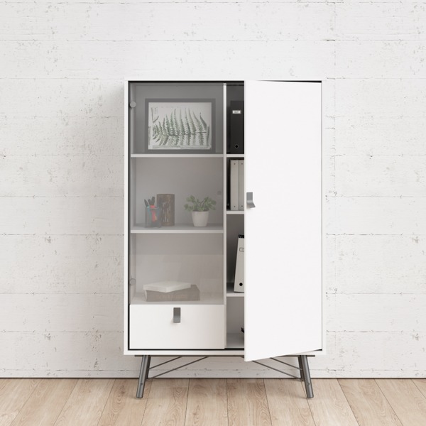 Biała witryna Ryan z czarnym wykończeniem i metalowymi uchwytami