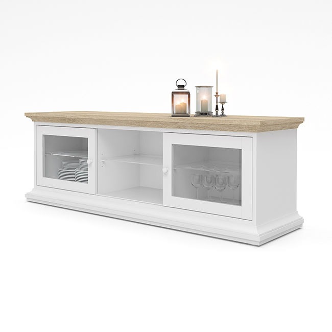 Romantyczna szafka TV Paris biały mat, blat dąb sonoma